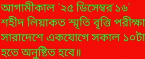 শহীদ লিয়াকত স্মৃতি বৃত্তি পরীক্ষা’১৫ আগামী ১৮ই ডিসেম্বর শুক্রবার সকাল ৯টা হতে ১২টা পর্যন্ত সারাদেশে একযোগে অনুষ্ঠিত হবে।